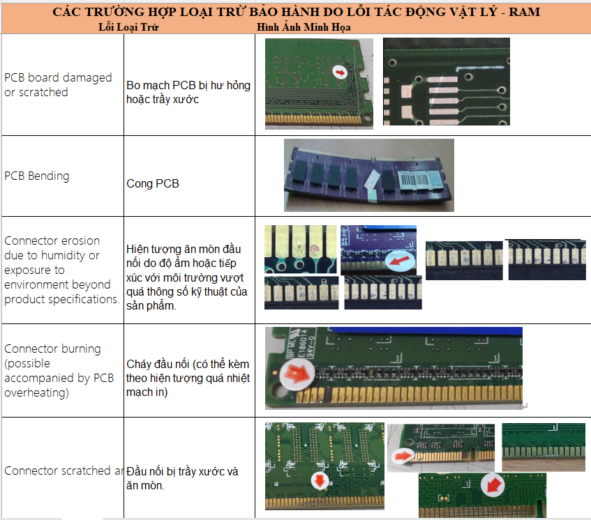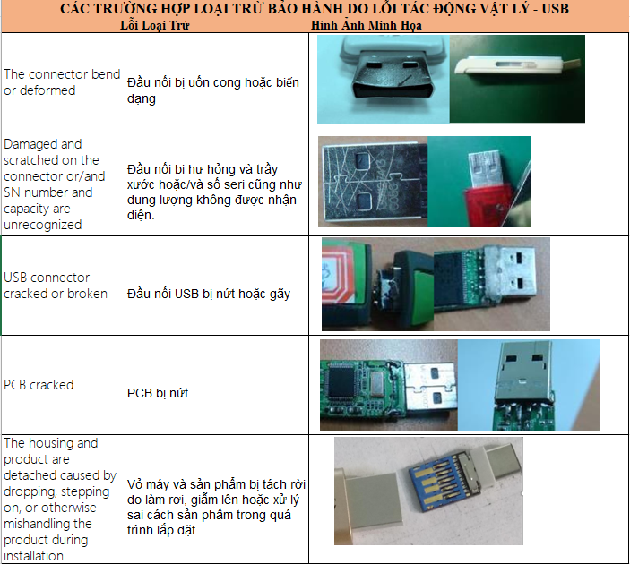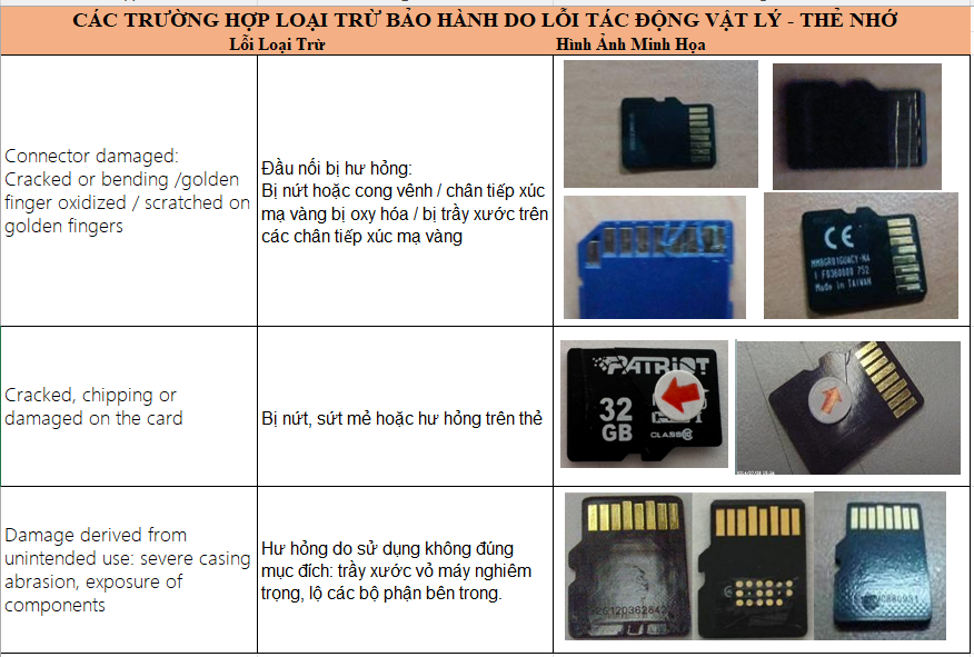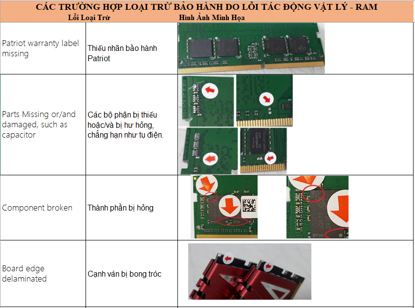 Hãng Patriot kiểm duyệt rất chặt trẽ về các lỗi hư hại vật lý, do lắp đặt sử dụng và bảo quản, do vậy rất mong quý đại lý và khách hàng cần lưu ý khi sử dụng và kiểm tra tình trạng hàng lỗi khi tiếp nhận. Cụ thể các hình ảnh và tình huống được liệt kê như sau: